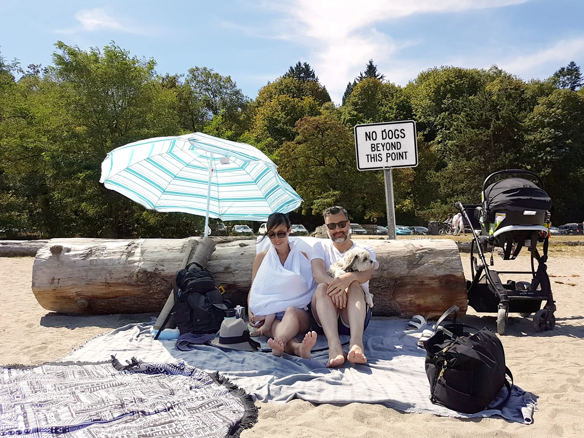 Throw a towel over the log as a backrest, get wife and baby into the shade of the umbrella that has the quality and coverage of a large kleenex tissue. Hide the dog between us to avoid some bullshit fine. Feed the baby.